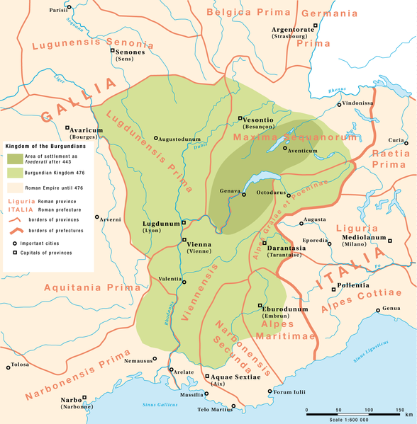 Kingdom of the Burgundians after the settlement in Savoy from 443 (source : Wikipedia)