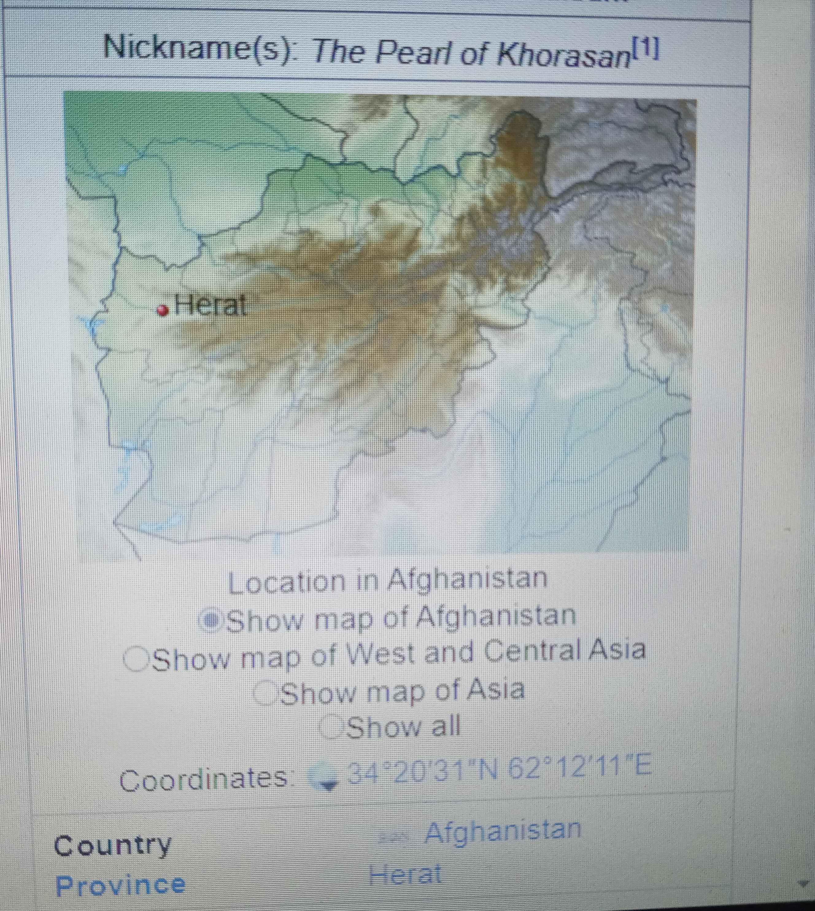 아프카니스탄의 Herat 도시의 위치