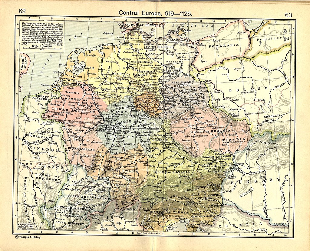 Central Europe, 919–1125. The Kingdom of Germany included the duchies of Saxony (yellow), Franconia (blue), Bavaria (green), Swabia (orange) and Lorraine (pink left). Various dukes rebelled against Otto's rule in 937 and again in 939.