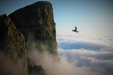 The Faroe Islands are made up of an approximately six-kilometres-thick succession of mostly basaltic lava that was part of the great North Atlantic Igneous Province during the Paleogene period.[31] The lavas were erupted during the opening of the North Atlantic ocean, which began about 60 million years ago, and what is today the Faroe Islands was then attached to Greenland.[32][33] The lavas are underlain by circa 30 km of unidentified ancient continental crust.[34][35]