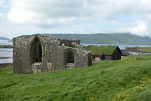 Archaeologist Mike Church noted that Dicuil, an Irish monk of the early ninth century, may have mentioned the Faroes. Dicuil wrote in his geographical work De mensura orbis terrae that there were heremitae ex nostra Scotia ("hermits from our land of Ireland/Scotland") who had lived on the northerly islands of Britain for almost a hundred years until the Vikings arrived.[19] Church suggested that the people living there might have been from Ireland, Scotland, or Scandinavia, or possibly from all three.[20] According to a ninth-century voyage tale, the Irish saint Brendan visited islands resembling the Faroes in the sixth century. This association, however, is not conclusive.[21]