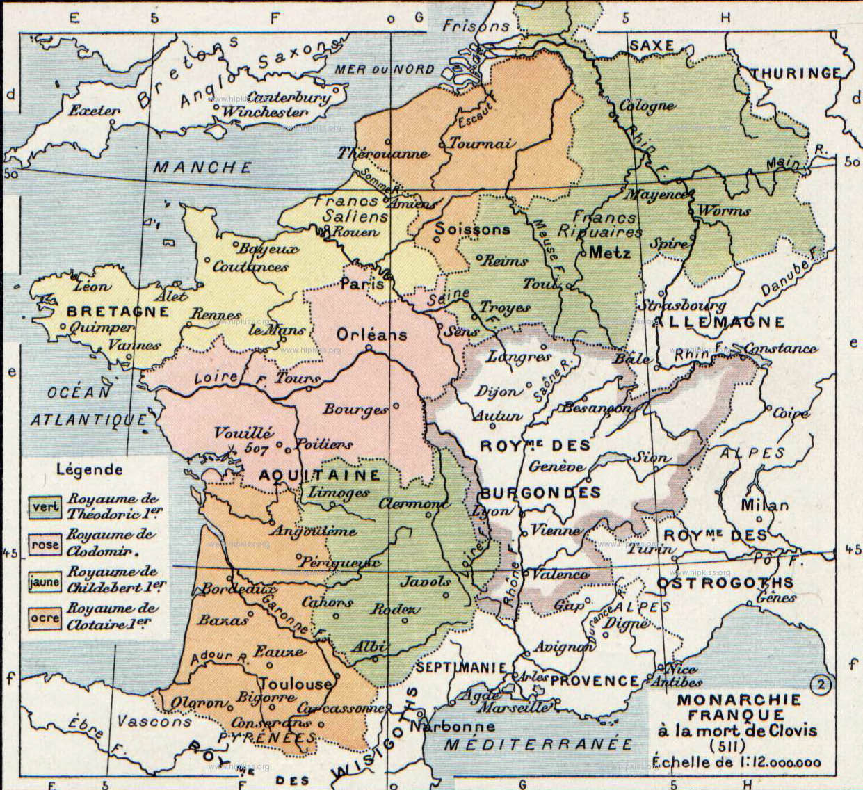 Division of Gaul on Clovis's death (in 511), showing Theuderic's kingdom beside his brothers' (source : Wikipedia)