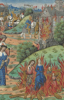 Between 1 September and 31 August 559, with the help of the Bretons, Chram plundered and destroyed a large number of places belonging to his father. Chlothar, accompanied by his son Chilperic, advanced to Domnonée and arrived there in November or December of 560. During the battle, located near the coast, Conomor was defeated and killed when he attempted to flee. Conomor owned land on both sides of the Channel, and Chram perhaps intended to flee from Chlothar to take refuge in England with the support of Conomor. Chram fled for the sea, but first attempted to rescue his wife and daughters. He was then captured and immediately sentenced to death. He and his wife and daughters were locked in a shack and were strangled and burned.[23] Overwhelmed with remorse, Clothar went to Tours to implore forgiveness at the tomb of St Martin and died shortly afterwards at the royal palace at Compiègne."