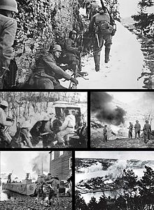 Vidkun Quisling proclaimed himself prime minister and appointed a government with members from the National Unity Party.[111] He was quickly set aside and replaced by Josef Terboven, but reinstated in 1942. The Norwegian Campaign continued in Northern Norway and the government fled to London on 7 June.[112] The German occupation resulted in a brutalization of society and 30,000 people were imprisoned.[113] 55,000 people joined the National Unity Party, which became the only legal party. But the nazification process failed after the Supreme Court resigned and both organized sports and bishops boycotted the new regime.[114] A resistance movement was established and was coordinated from London from 1943.[115] Stokker reports that hostile humour against the Germans helped maintain morale and build a wall against collaboration. Jokes made the rounds dripping with contempt for the oppressors, ridicule of Nazi ideology, stressing the cruelty of the Nazis and mocking their inflated self-image. People on the street asked, "Do you know the difference between the Nazis and a bucket of manure? The bucket." In Post Office lines they explained, "It's rumored that we're getting new stamps bearing Quisling's likeness, but distribution has been delayed because no one knows which side to spit on." The jokes worked to educate Norwegians about the occupation, and encourage a sense of solidarity.[116] At the time of German surrender on 8 May 1945, there were 360,000 German soldiers in the country.[117]