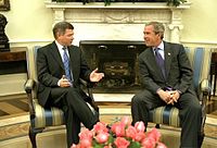 Norwegian King Harald V and Norwegian Queen Sonja, greeted by First Lady of the United States U.S. President George W. Bush and his wife, Laura Bush at the White House during a state visit in Washington, D.C., United States, in March 2005.
