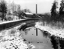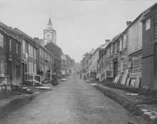 The textile industry started in the 1840s, which was followed up with mechanical workshops to build new machinery as the British embargo hindered import of textile machinery.[76] An economic crisis hit the country from 1848, resulting in Marcus Thrane establishing the first trade unions and demanding that equality before the law be independent of social class. Parliament passed a series of laws abandoning economic privileges and easing domestic trade during the 1840s and 1850s.[77] Population increase forced the clearing of new land, although some of the growth came in the cities. The population of Christiania reached 40,000 in 1855.[78] By 1865 the population reached 1.7 million; the large increase was largely caused by better nutrition from herring and potatoes, a sharp decrease of infant mortality and increased hygiene.[75] Emigration to North America started in 1825, with the first mass emigration commencing in the 1860s. By 1930, 800,000 people had emigrated, the majority settling in the Midwestern United States.[78]