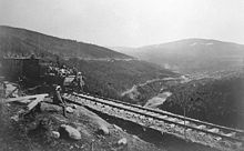 The population decrease resulted in a labor shortage in the agriculture, which again resulted in increased use of machinery and thus capital. The government stimulated the process through the creation of the Mortgage Bank in 1851 and the State Agricultural College eight years later.[79] The 19th century saw a large increase of road construction and steamship services commenced along the coast. The first railway, the Trunk Line between Christiania and Eidsvoll opened in 1854, followed a year later by the first telegraph line. Export industry commenced with steam-powered sawmills in the 1860s, followed by canned herring, wood pulp and cellulose. From 1850 to 1880 the Norwegian shipping industry enjoyed a large boom, stimulated by the abolishing of the British Navigation Acts. By 1880 there were 60,000 Norwegian seamen and the country had the world's third-largest merchant marine.[80] As the first coast-to-coast railway, the Røros Line connected the capital to Trondheim in 1877.[81] Norway joined the Scandinavian Monetary Union in 1875 and introduced the Norwegian krone with a gold standard,[82] along with the metric system being introduced.[83]