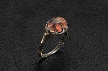 A ring was found during the archeological excavations at Birka between 1872 and 1895, when archeologist Hjalmar Stolpe discovered it in a 9th-century Viking woman's burial. It is made of high-quality silver alloy and is set with a pink-violet oval glass.[32] The ring, preserved at the Swedish history museum, became known as the "Allah ring" because of the pseudo-Kufic inscription found on the ring's glass that resembles the word Allah (Arabic: الله). While other rings were found at the Birka excavations, the "Allah ring" was the only one that had this type of inscription. The Arabic historical linguist Marijn van Putten argued that the inscription on the ring was an example of pseudo-Kufic and that it has no meaning in Arabic.[33] Nevertheless, other analysts extrapolated that the pseudo-Kufic engraving was indeed Arabic and that this was sufficient evidence to directly link Vikings to Islamic civilization.[32] In her Twitter thread on the "Allah” textile, Stephennie Mulder drew on the work of van Putten to argue that like the textile, the ring had been similarly misunderstood.[28] However, she acknowledged that the Arabic language—found on the ring and other objects from Birka—was appreciated by the Vikings as a sign of social status.[28] The inscription could suggest that the ring's owner might have been one of the Viking elites who were in contact with the Islamic world via trade or travel.[34]