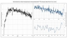 Global temperature records taken from ice cores, tree rings, and lake deposits have shown that the Earth may have been slightly cooler globally (by 0.03 °C) than in the early and the mid-20th century.[10][11]
