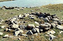The culture of the Thule people varied greatly from the Dorset. Their success in hunting bowhead whales was facilitated through their use of large boats, and their vast foraging range through the use of dog sleds.[10] In prime whaling areas, known Thule sites regularly contain fifteen to twenty houses, and in one case sixty.[11][12] Clusters of houses suggest extended family units,[13] and communal structures dedicated to ceremony have also been identified.[10] Some form of hierarchical social structure may be identifiable though variations in dwelling size, form, and content (whaling equipment, non-local goods, etc.) which could point to a difference in social status between families or households.[12] The presence of small quantities of native copper from the western arctic and meteoric iron from north-west Greenland indicate the existence of trade networks taking place in Thule culture.[14]