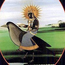 The Hindu deity Shani is often represented as being mounted on a giant black raven or crow.[25] The crow (sometimes a raven or vulture) is Shani's Vahana. As a protector of property, Shani is able to repress the thieving tendencies of these birds. Dhumavati, the widow goddess associated with strife and inauspiciousness, is depicted riding a crow or in a horseless chariot bearing an emblem of a crow.