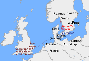 Ecgþeow was in the service of the Geatish king Hreðel, whose daughter he married. They had Beowulf, who grew up with the Geats. Beowulf's childhood friend was Breca the Bronding "supposed to be the inhabitants of the island Brännö, lying off the coast of West Gothland in the Cattegat".[11] This would be a realistic location for a childhood friend of Beowulf, and the poem describes a swimming contest between them.