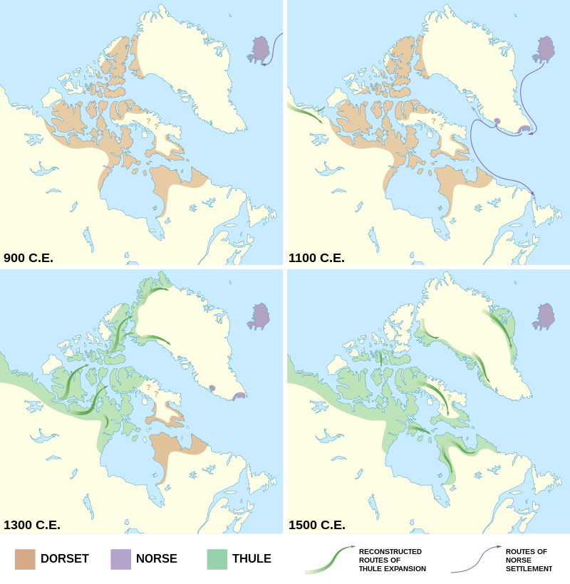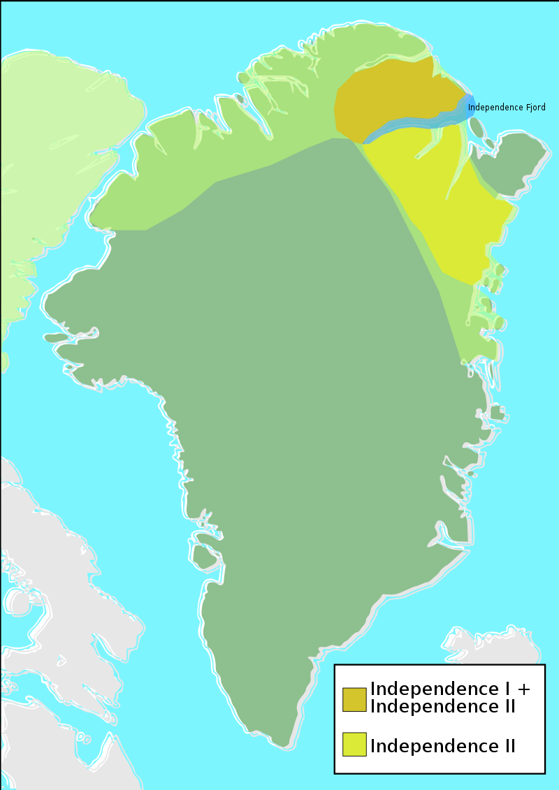 From 2400 BC to 1300 BC, the Independence I culture existed in northern Greenland. It was a part of the Arctic small tool tradition.[35][36][37] Towns, including Deltaterrasserne, started to appear. Around 800 BC, the Saqqaq culture disappeared and the Early Dorset culture emerged in western Greenland and the Independence II culture in northern Greenland.[38] The Dorset culture was the first culture to extend throughout the Greenlandic coastal areas, both on the west and east coasts. It lasted until the total onset of the Thule culture in 1500 AD. The Dorset culture population lived primarily from hunting of whales and caribou.[39][40][41][42]