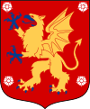 From 1560, Östergötland was represented with two separate coats-of-arms seals until 1884, when the current one was granted. The coat of arms is represented with a ducal coronet. Blazon: "gules a griffin with dragon wings, tail and tongue rampant or armed, beaked, langued and membered azure between four roses argent."
