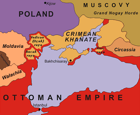 The Crimean Khanate in about 1600. Note that the areas marked Poland and Muscovy were claimed rather than administered. (source : Wikipdia)