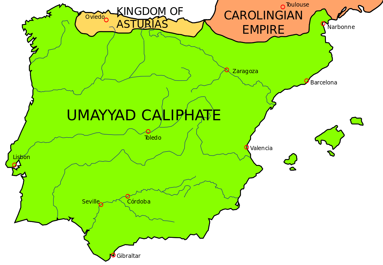 아래 지도는 750년경의 우마이야왕조가 이베리아반도지역의 점령지역을 표시하고 있다. 일부 북부지역을 제외하고는 이베리아 반도의 대부분의 지역을 차지하고 있으며, 북쪽으로 프랑크왕국과 접하고 있으나, Narbonne지역은 우마이야왕조의 지역으로, Toulouse지역은 프랑크왕국의 지역으로 묘사된다.