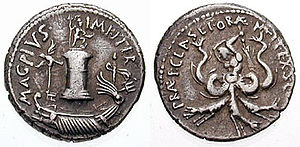 섹스투스 폼페이우스가 옥타비아누스의 함대를 상대로 이긴 것을 기념하여 주조한 데나리우스. 앞에는 옥타비아누스의 함대를 이긴 기함 메시나의 파루스가, 뒤에는 괴물 스킬라가 새겨져 있다.