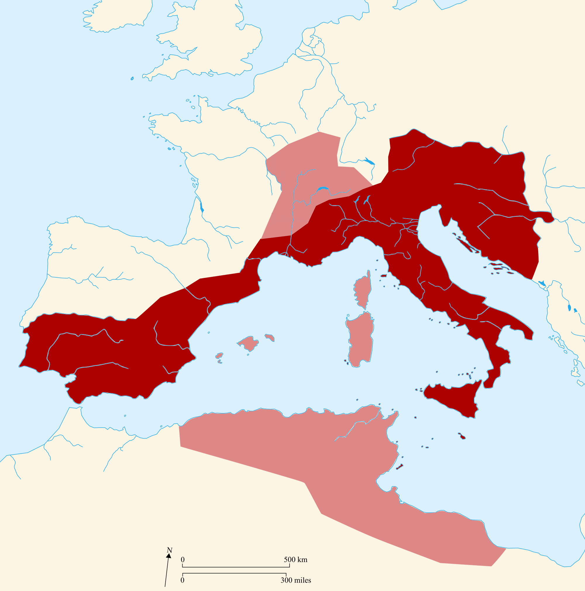 북아프리카와 코르시카섬, 샤르데냐섬은 반달족의 차지로 표시되는데, 이러한 반달족의 정복에는 Alans, Goths 모두 참여 하였기 때문에, 실질적인 고구려 세력으로 보인다. 반달족은 광개토태왕 시기 서진할 때부터 고구려와 같이 행동했었다. 그리고 반달족이 이태리반도를 공격할 시기에, 신라에서는 왜의 침입이 많은 것으로 나타난다. 북아프리카지역을 필자는 왜의 세력 지역으로 추정했다. 물론 일부는 가야세력이 있었다.