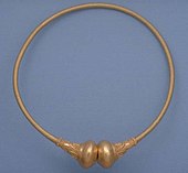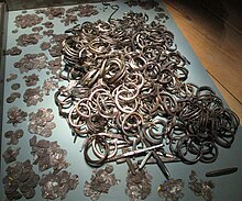 On 16 July 1999, the world's largest Viking silver treasure, the Spillings Hoard, was found in a field at Spillings farm northwest of Slite.[25] The silver treasure was divided into two parts weighing a total of 67 kg (148 lb) (27 kg (60 lb) and 40 kg (88 lb)) and consisted mostly of coins, about 14,000, from foreign countries, mostly Islamic.[26] It also contained about 20 kg (44 lb) of bronze objects along with numerous everyday objects such as nails, glass beads, parts of tools, pottery, iron bands and clasps. The treasure was found by using a metal detector, and the finders fee, given to the farmer who owned the land, was over 2 million kronor (about US$308,000).[27] The treasure was found almost by accident while filming a news report for TV4 about illegal treasure hunting on Gotland.[28]