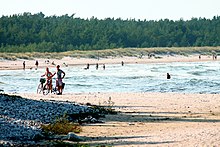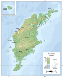 There are several shallow lakes located near the shores of the island. The biggest is Lake Bästeträsk, located near Fleringe in the northern part of Gotland. The Hoburg Shoal bird reserve is situated on the southern tip of the island.[43] The highest point of the island is Lojsta Hed which stands 82 m (269 ft) above sea level. The average height of the island is 29 meters.[44]