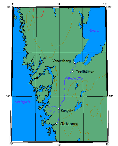 "The Göta älv (Swedish pronunciation: [ˈjø̌ːta ˈɛlv]; "River of (the) Geats") is a river that drains lake Vänern into the Kattegat, at the city of Gothenburg, on the western coast of Sweden. It was formed at the end of the last glaciation, as an outflow channel from the Baltic Ice Lake to the Atlantic Ocean and nowadays it has the largest drainage basin in Scandinavia.