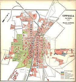 These factors caused a large population growth in the city. Between 1870 and 1900 the population doubled from 11,433 to 22,818 inhabitants.[10] For the first time the city expanded outside of the old city square which was plotted in the city plan of 1643. The city expanded into the districts of Luthagen and Svartbäcken in the north, and Vaksala in the east.[7]