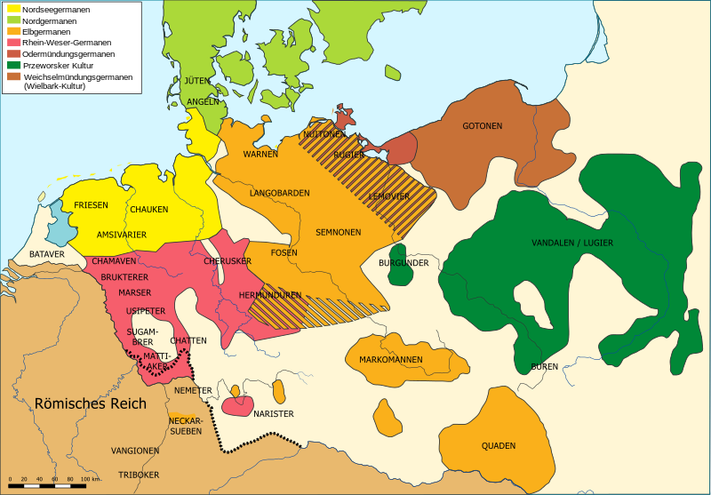 Tribes of Central Europe in the mid-1st century AD. The Vandals/Lugii are depicted in green, in the area of modern Poland. (source : Wikipedia)