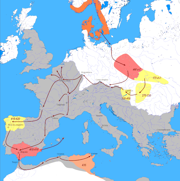 Migrations of the Vandals from Scandinavia through Dacia, Gaul, Iberia, and into North Africa. Grey: Roman Empire. (source : Wikipedia)