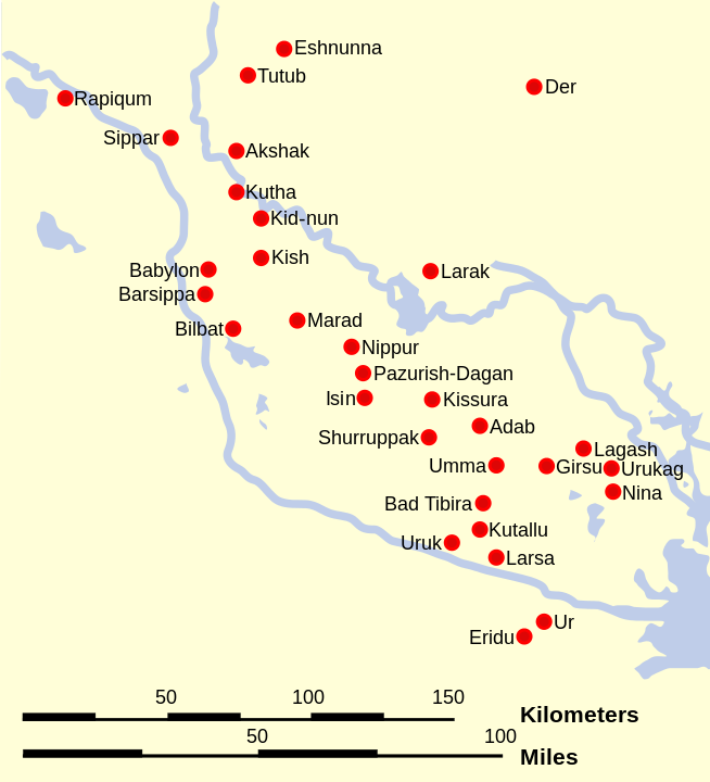 Map of Old cities in Sumer including Kish (지도 중앙부분) (source : Wikipedia)