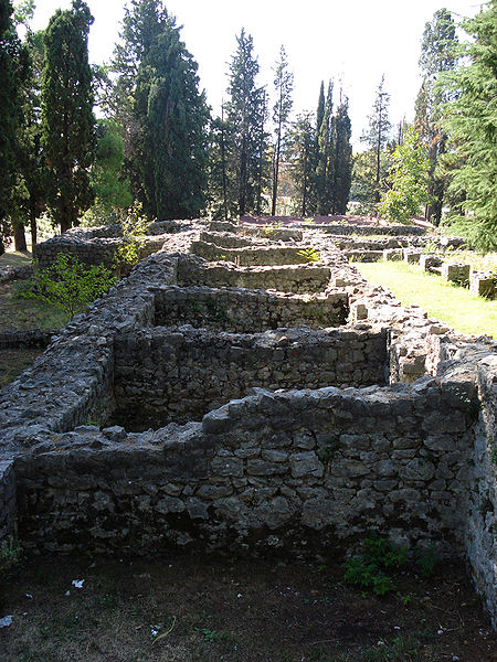 "An Italic settler had a private manor complex built for agricultural purposes on the Mogorjelo site in the mid first century CE.[1] He located the building designed for processing agricultural produce (villa rustica fructuaria) on a salient on the hill (the ground plan of the villa lies near the north or main gate of the walls of later date), and the residential building (villa rustica habitatoria) on the south slope exposed to the sun.[1] This building burned down in the third century.[1] In the early fourth century, a state-owned estate was constructed over the ruins, with a villa which now forms the major feature of the complex.[1] During the third century the property probably changed hands to become state-owned. The villa at Mogorjelo supplied the town of Narone, the ruins of which lie in the village of Vid near Metković.[1] The estate was destroyed in a major fire.[1] The latest coins discovered on this site, in a layer of soot, were minted by Honorius in 388, so that it may be assumed that Mogorjelo fell into enemy hands some time between 401 and 403 with the Visigoth invasion of these parts.[1] "